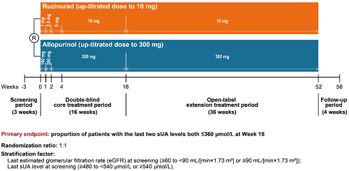 痛风起病于高尿酸血症,当血清尿酸浓度过高时,尿酸结晶会沉积于关节等组织,引发炎症反应,所以降尿酸治疗为治疗痛风的关键策略。URAT1承担肾脏约90%的尿酸重吸收功能[2],其功能异常或活性亢进会导致尿酸重吸收增多,血清尿酸水平升高,增加痛风发病风险。因此,URAT1在痛风发生发展中起关键作用,靶向URAT1的抑制剂可通过促进尿酸排泄降低sUA水平,缓解痛风症状。鲁兹诺雷钠片是DB真人医药自主研发的一种高选择性URAT1抑制剂,在前期的一期、二期研究中,鲁兹诺雷钠片耐受性良好,并显示出显著降低高尿酸血症患者sUA的效果[3]。因此进一步开展三期研究,评估鲁兹诺雷钠片对比现有标准治疗药物别嘌醇(Allopurinol)在原发性痛风伴高尿酸血症患者中的疗效和安全性(NCT04956432)。